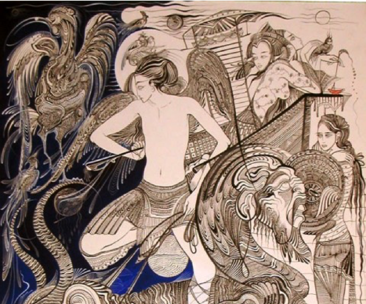 გამოსახულია დიდი მუქი ფერის ლაქები - თითქოს ცა საავდროდ ემზადება, ნახატი გაფორიაქებს.